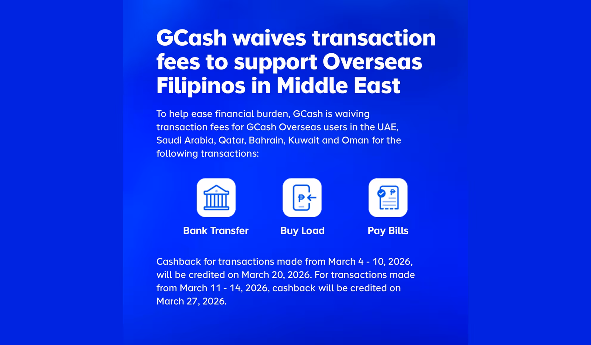 GCash is waiving transaction fees on bank transfers, bill payments, and mobile load purchases for GCash Overseas users in the United Arab Emirates, Qatar, Bahrain, Kuwait, Saudi Arabia, and Oman to help ease their financial burden amid the ongoing developments in the Middle East.